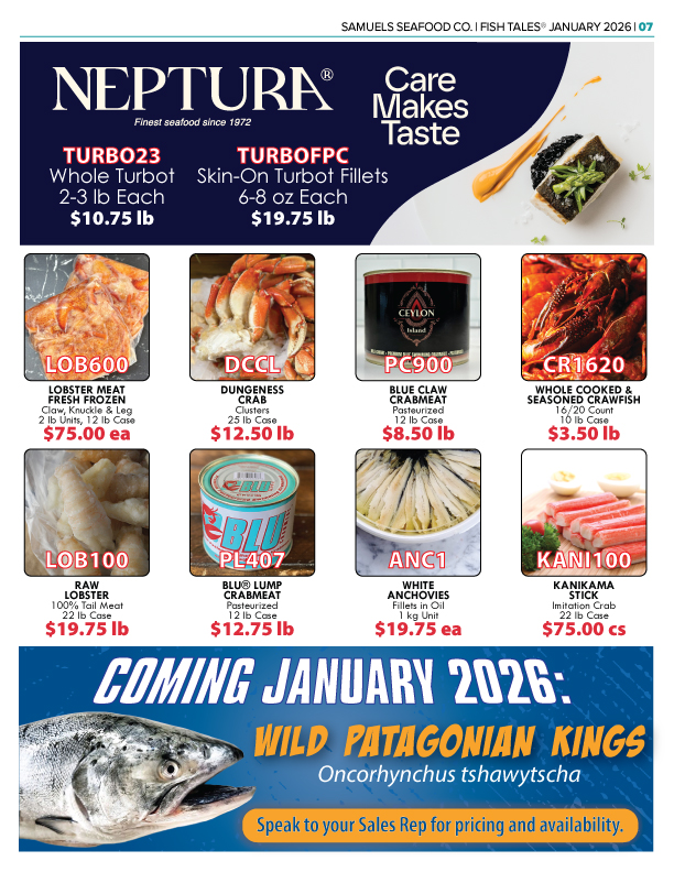 Check out our monthly specials, you never know what you might find. Every month we feature fresh and frozen seafood, as well as other items to round out your menu. From appetizers to entrees to condiments, we tried to think of everything. Contact your sales representative to place an order.