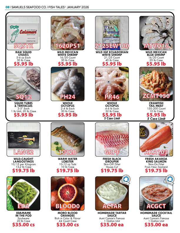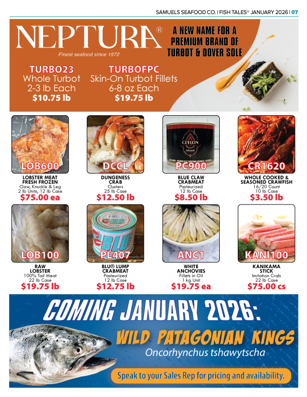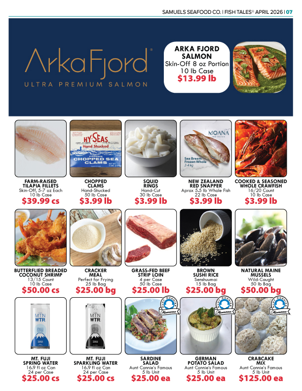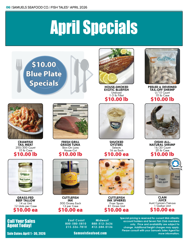 Check out our monthly specials, you never know what you might find. Every month we feature fresh and frozen seafood, as well as other items to round out your menu. From appetizers to entrees to condiments, we tried to think of everything. Contact your sales representative to place an order.