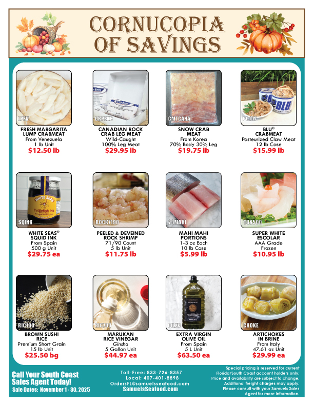 Check out our monthly specials, you never know what you might find. Every month we feature fresh and frozen seafood, as well as other items to round out your menu. From appetizers to entrees to condiments, we tried to think of everything. Contact your sales representative to place an order.